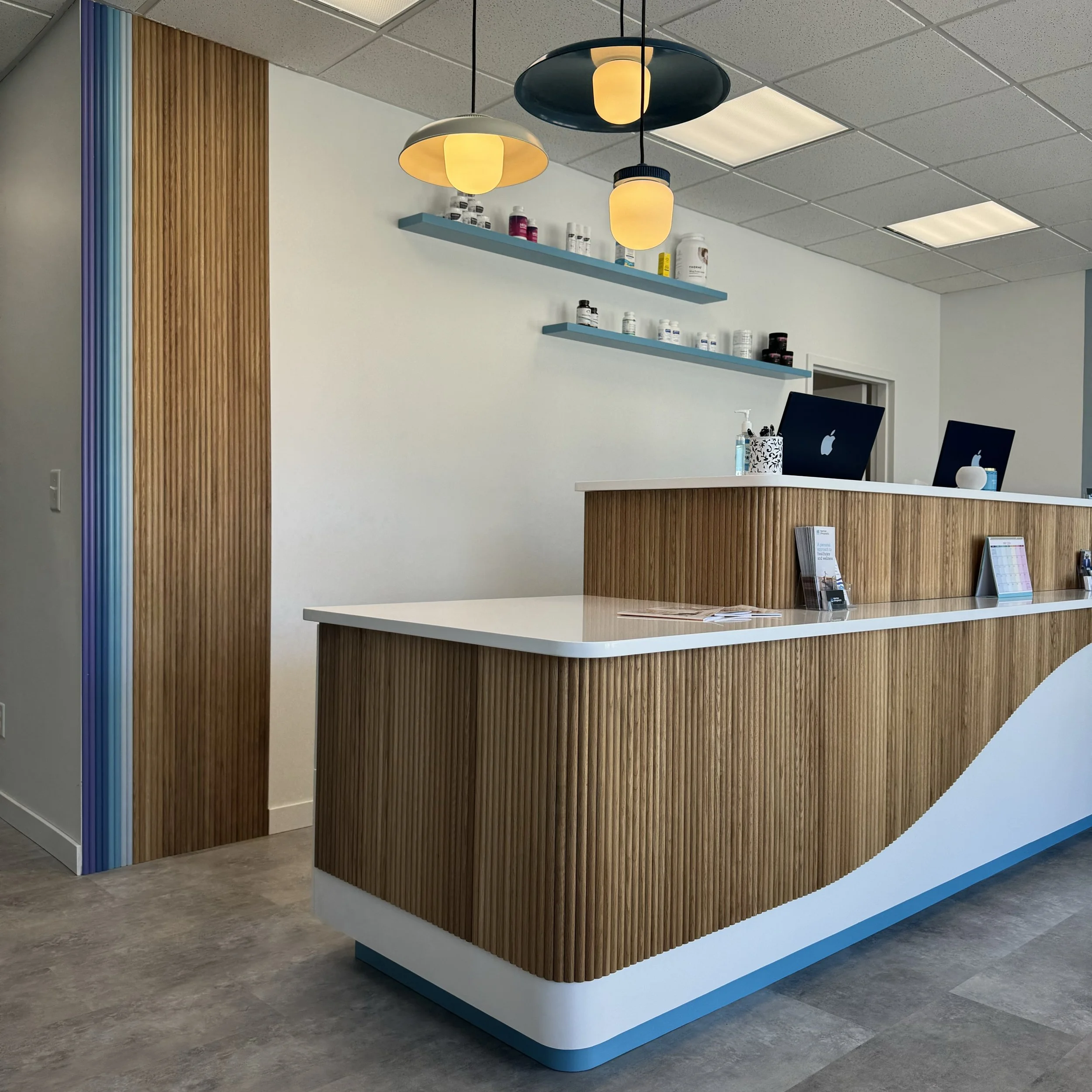 The moment you step into our newly renovated office, you’ll notice the fresh, modern design of our reception area. Ashley Bongo Design has created a space with comfortable seating, warm lighting, and a welcoming atmosphere, where you can relax before your session. Our friendly front desk staff, led by Alyssa, is always ready to assist you with a smile, making sure you feel at home from the moment you arrive.